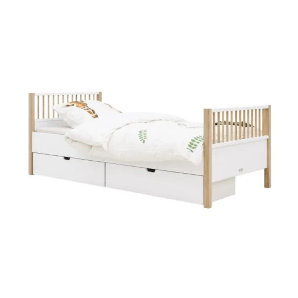 Het Bopita Mika Bed Wit / Eiken 90 x 200 cm kenmerkt zich door de eiken accenten. Verder is het bed gemaakt van hoogwaardig materiaal en afgewerkt met een lak op waterbasis waardoor het kind- en milieuvriendelijk is. Daarnaast wordt het bed geleverd inclusief lattenbodem en exclusief matras. Het is ook mogelijk om een uitvalbeshermer te plaatsen. Onder het bed is ruimte voor de Corsica bedlade, ideaal om speelgoed en allerlei andere spulletjes in op te bergen.