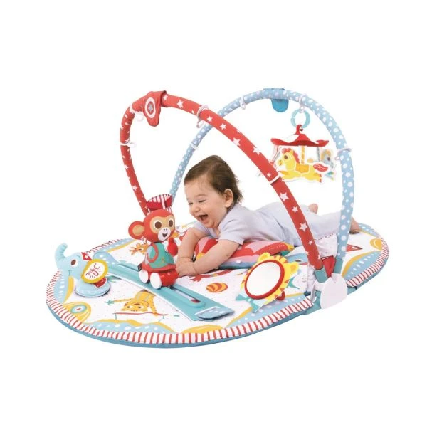 Het Yookidoo Gymotion Circus Playland Speelkleed is voor drie fases ontwikkeld. Als eerste kan je kindje vanaf de geboorte al naar de hangende speeltjes kijken. Bovenop de speelbogen hangen verschillende figuren, zodat je kindje het kan volgen. Is je kindje wat ouder en kan het al draaien? Dan is het leuk om het spiegeltje op het speelkleed te pakken. Zo Kan je kindje alles bekijken. Als je kindje kan zitten dan kan het zelf allerlei speeltjes pakken en overal mee spelen en kunnen de speelbogen er afgehaald worden. Het speelkleed is erg makkelijk op te vouwen en mee te nemen.